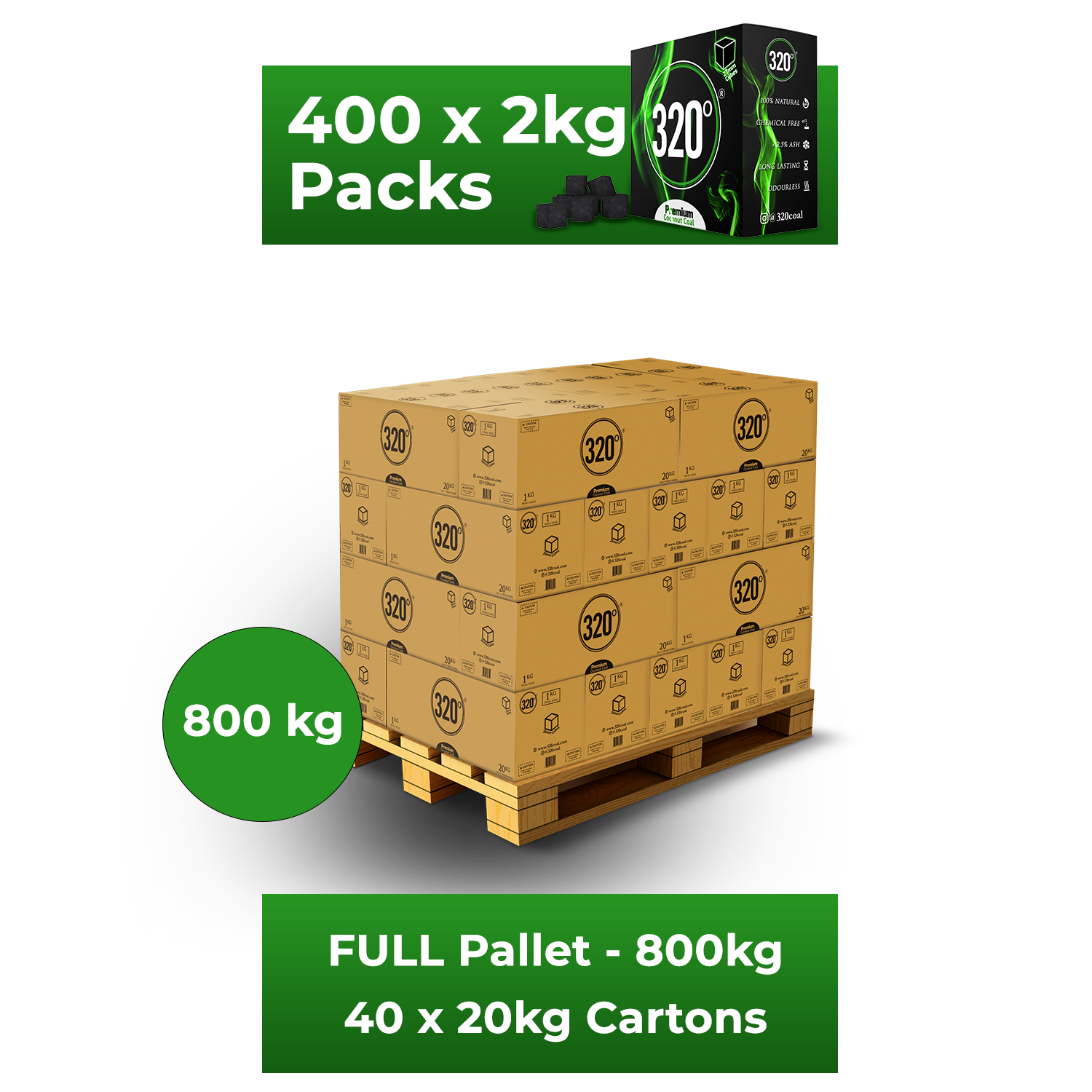 320° 800 KG Premium Coconut Shisha Charcoal Coal (27mm Cubes) for Hookah BBQ – Full Pallet – 40 x 20kg Cartons